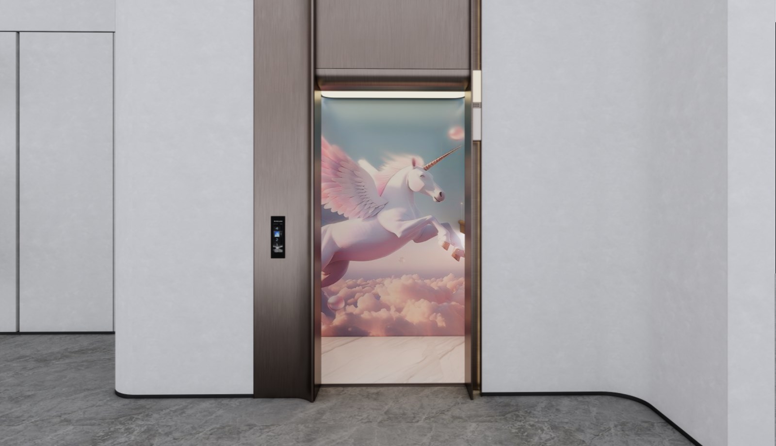 瑞卡思极具前瞻性地捕捉到了这一文化符号与电梯产品属性之间的完美契合。当乘客站在AURA轿厢中,电梯启动的瞬间,物理层面的失重感与视觉画面中飞马跃入云端的情境产生了强烈的同频共振。这是一种极其高明的沉浸式设计手法——它让乘客产生了一种与飞马并肩穿越云层、突破现实束缚的错觉。
